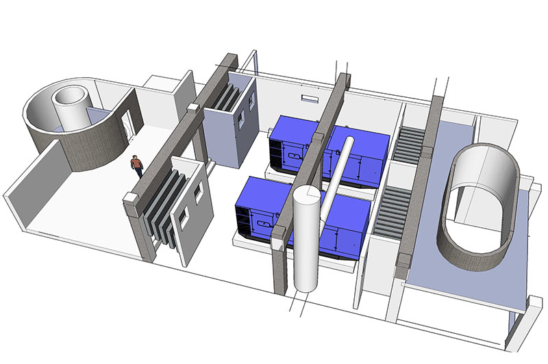 - Electrical, acoustic and ventilation pre-study: dimensioning of materials to meet specifications (electrical cables, circuit breakers, sound traps, exhaust silencers, air inlet and outlet grilles, fans…)
