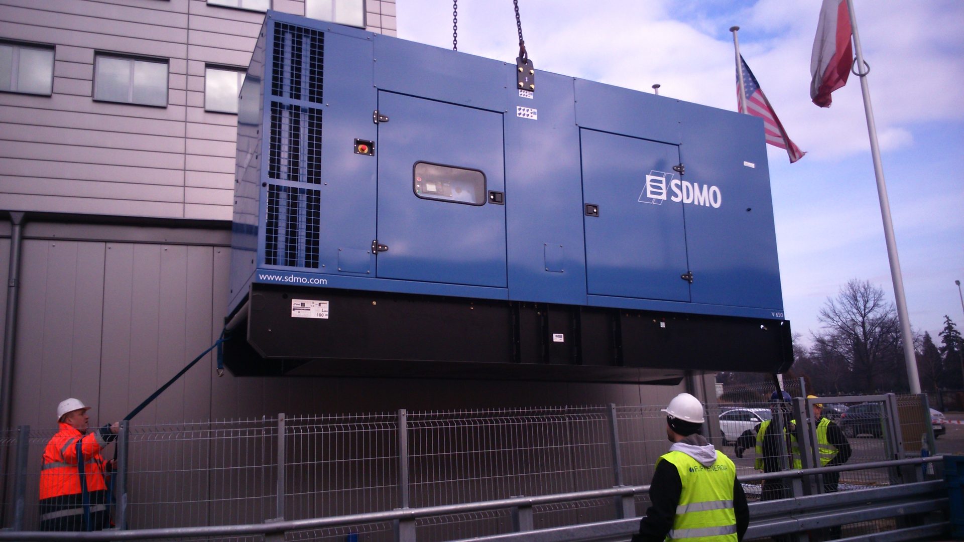 Livraison d’un groupe électrogène KOHLER SDMO V650 Silent DW à une salle de serveurs de Częstochowa et la pose de celui-ci sur le toit du bâtiment. Groupe électrogène d’une puissance de 650 kVA.